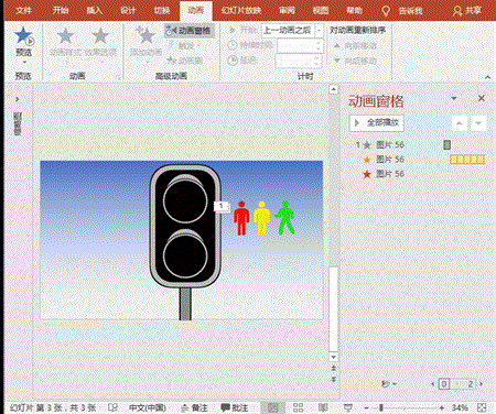 (2)黄色和绿色人像:保持红色人像为选中状态,双击“动画”-“动画刷”按钮,分别刷黄色和绿色人像,开始均设置为“上一动画之后”、黄色重复为6、绿色重复为18。