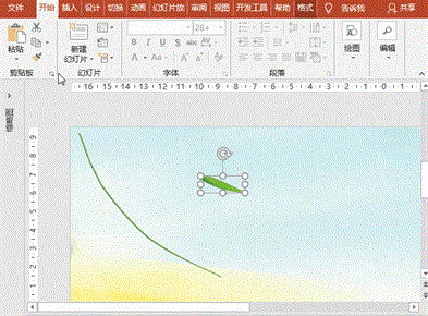 (2)燕子萦绕:执行“动画”菜单-“添加动画”-“动作路径”之“自定义路径”,绘制从幻灯片外到图片上飞行的动画,设置开始时间设为“与上一动画同时”、持续时间为6秒,延迟为0秒;