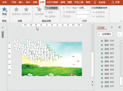 (3)整片柳叶动画:选择已设的单片柳叶,双击“动画”菜单-“动画刷”按钮,从左至右顺次点击各片柳叶,并在动画空格中将各片柳叶的延迟时间递增0.5秒;