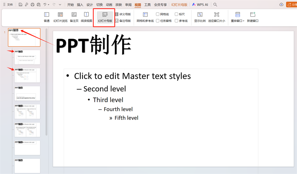 点击顶部菜单栏的「视图」,选择「幻灯片母版」进入母版编辑模式。