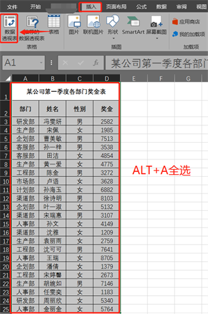- 步骤1、首先,【ALT A】全选中总表中的数据,然后选择【插入】,再需选择【插入数据透视表】,如下图所示: