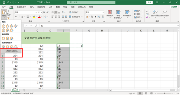 选中文本单元格,点击菜单栏上“粘贴-选择性粘贴”。