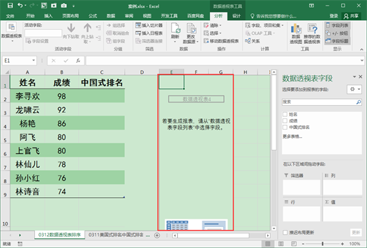 3.在窗口右侧的“数据透视表字段”窗格中,选中上方的“姓名”字段,按住鼠标左键不放拖曳到下方的“行”区域;选中上方的“成绩”字段,按住鼠标左键不放拖曳到下方的“值”区域,注意这里要将“成绩”字段往“值”区域拖曳2次。第2个“成绩”字段在数据透视表中会显示为列标题“求和项:成绩2”。