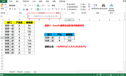 案例解析:我们需要计算销售一部销售的A产品和销售二部销售的B产品的总销售额,这里就涉及数据的多条件求和操作。