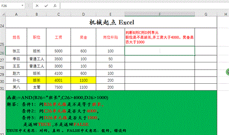函数:=AND(B26=”班长”,C26>4000,D26>1000)