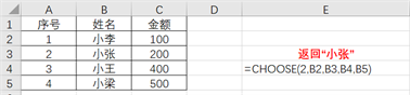公式=CHOOSE(2,B2,B3,B4,B5),返回值=小张