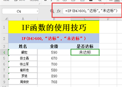 1、在C4单元格中输入【=IF(B4>600,”达标”,”未达标”)】。(注意公式中除了汉字以外,其他全用英文输入法输入哦!)