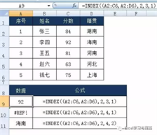 - A9单元格的公式为“=INDEX(A2:D6,2,3)”,即返回的是数据A2:D6中,第2行,第3列中的数据,即C3单元格中的数据“92”。