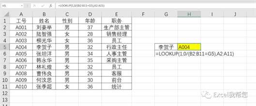最佳答案用法1:正向查找根据姓名查找职务公 式:=LOOKUP(1,0/(B2:B11=G5),E2:E11)套用结构:=lookup(1,0/(查找值=查找列),结果列)用法2:反向查找根据姓名查找工号公 式:=LOOKUP(1,0/(B2:B11=G5),A2:A11)套用结构:=lookup(1,0/......