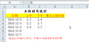 接下来我们看另外一个例子,从图中我们可以看出需要求一天的累计上班时间,其中超过4小时按4小时计,不够4小时按实际时间计算,我们的思路应该是将各个上班时间跟4进行对比取最小值相加,可是当我们用公式=MIN(B3,4) MIN(C3,4)来计算的时候发现在没有时间的地方会默认为上班8小时。