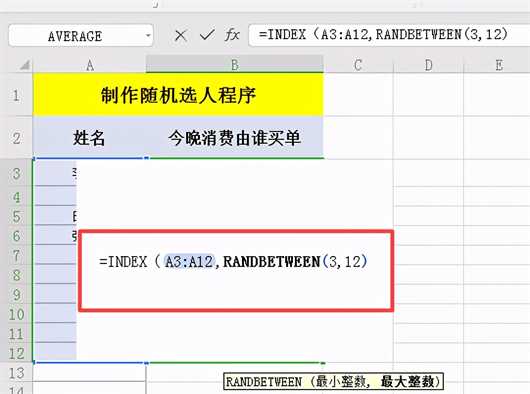4、继续在后面输入逗号,然后输入【RANDBETWEEN】,在后面的括号里输入【3,12】(意思就是3到12对应的名字)
