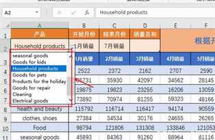 在下图所示,作者设置的条件是,产品为“Household products”,时间段是6月至7月的销量。所以我们的思路就是先选中符合条件的单元格区域,再进行求和计算。