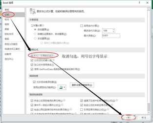 4、如果不想列号以数字显示,直接将“公式”选项卡下的“R1C1引用样式”取消前面复选框的勾即可。