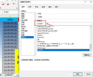 点击自定义格式,在类型框输入“mmdd”,会得到与写入TEXT函数相同的效果,需注意的是,它仍然需要引用的数据为常规的时间格式,如时间2还是无法自动转换的。