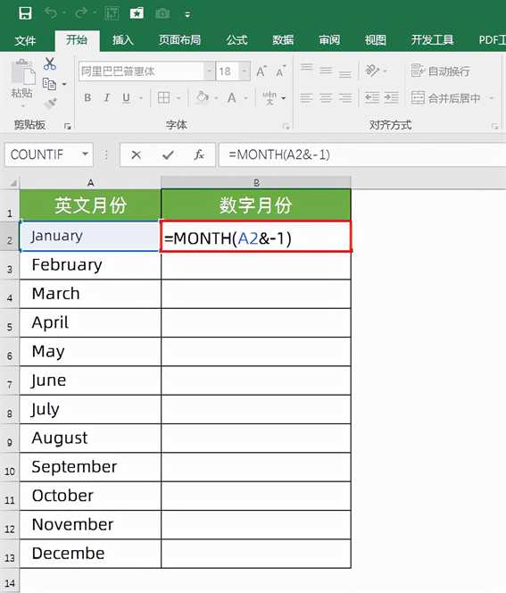1 选中B2单元格,在英文状态下输入公式:=MONTH(A2&-1),回车确认公式,可以返回January对应的月份数字1。
