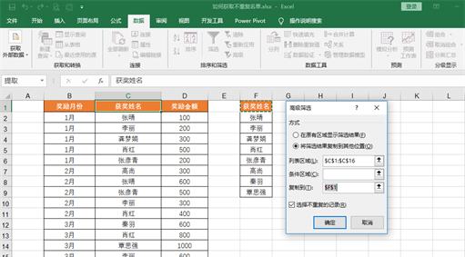 在数据菜单中,选择高级筛选(在筛选右侧),在高级筛选的对话框中,选择如下筛选条件,注意一定要勾选选择不重复的记录
