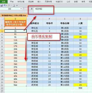 2、在J列插入辅助列,用来生成自然序列,K列作为生成指定数字的试场名称。在J2单元格输入:=ROW(A1),在K2单元格输入:=VLOOKUP(J2,$D$2:$G$21,4),向下复制填充到558号学生,就会自动生成,指定人数的考场名称。
