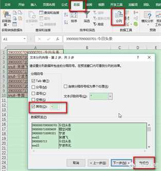 2. 选择“分隔符号”,点击“下一步”,在“其他”中输入“-”,在数据预览区可以看到处理后的效果,最后点击“完成”即可。