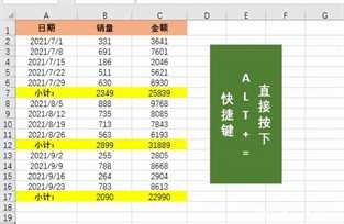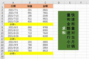 上图中是某公司产品不同日期的销量和金额,然后以每自然月为小计,进行销量和金额的总计。