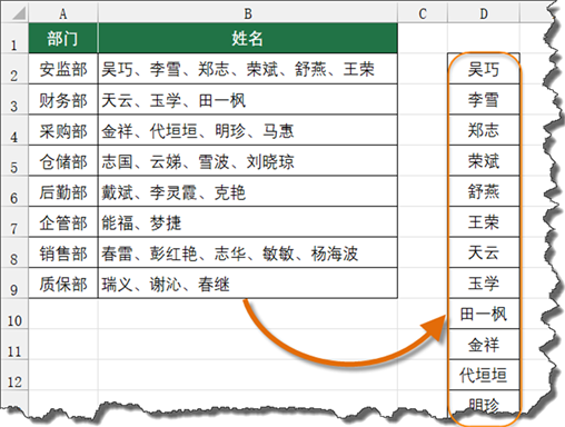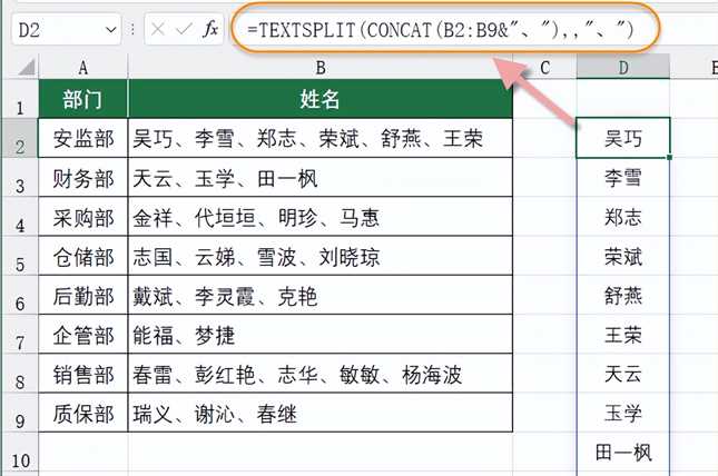 先使用CONCAT(B2:B9&”、”),把B2:B9单元格的内容连接到一起,每个单元格之间用逗号隔开,得到的结果作为待拆分的字符串。
