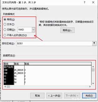 便进入到分列的第三步,对分列后数据的格式作选择,通常是默认的“常规”格式,但也可以选择为文本或日期格式,因此大家也可以通过分列的方法,将文本转换为可计算的常规格式,或将文本日期转换为可执行的日期格式。