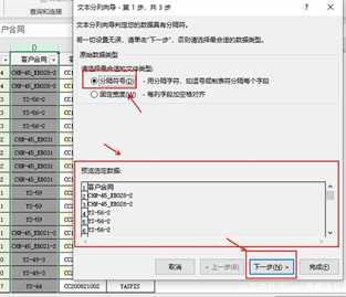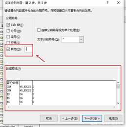 这是文本分列的第二步,设置分隔符号。由于客户合同号是通过“-”符号来进行分隔的,因此这里要勾选“其他”,并输入该符号。