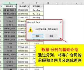 却突然弹出了一个提示框,显示“此处已有数据,是否替换它”,由于D列后面的列都有数据,执行分列时系统不会自动添加空列来分布数据。