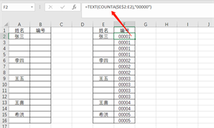 遇到这种情况,可以用COUNTA函数来完成,在单元格中输入公式=TEXT(COUNTA($E$2:E2),”00000″)