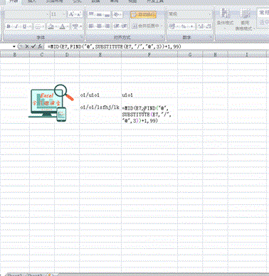 这时我们先选中需要的单元格→然后在【编辑栏】中输入函数=MID(E7,FIND(“”,SUBSTITUTE(E7,”/”,””,3))+1,99) →单击【enter】,即可得出前一列单元格中第三个特殊符号后的字符。