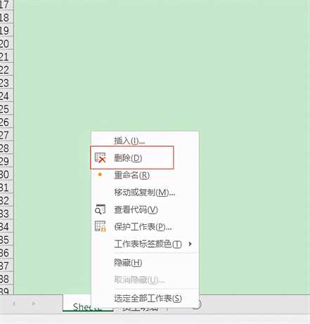 选中要删除的工作表后,单击鼠标右键,在弹出的快捷菜单中选择“删除”命令,即可删除该工作表,如下图所示: