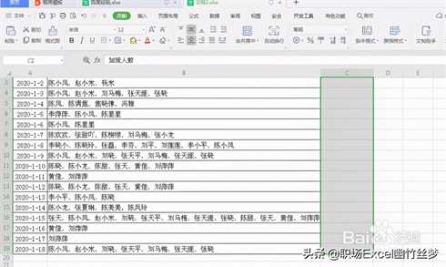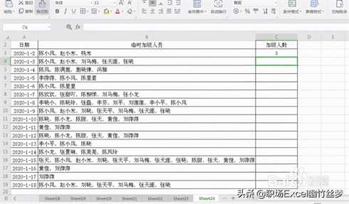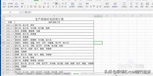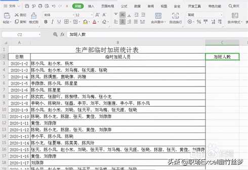 1、打开“生产部临时加班统计表”数据表,如图所示,含有“日期”、及“临时加班人员”相关信息,我们现在要根据临时加班人员快速统计出每天加班的人数。