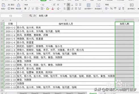2、单击选中“临时加班人员”右边的单元格并输入“加班人数”,然后按住鼠标左键往下拉到表格底部。选中该列,如图所示: