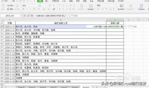 4、单击“临时加班人数”列下的第一个单元格,选中该单元格,然后在单元格内输入公式=LEN(B3)-LEN(SUBSTITUTE(B3,”、”,””))+1,然后按enter键,即可将第一个加班日期的人数统计出来,如图所示。单击选中第一个日期的加班人数,将鼠标放在该单元格右下角,当鼠标变为实心+时,按住鼠标左键不放往下拉到表格底部,即可将所有日期的加班人数统计出来。如图所示: