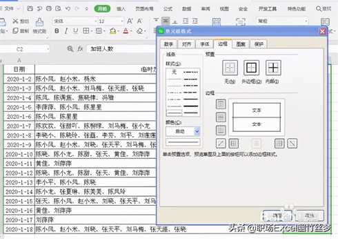 3、按键盘上的Ctrl+1键,进入单元格格式对话框。单击选择边框选项下预置下的外边框(O)和内部(I),然后单击确定,为“加班人数”一列添加边框。
