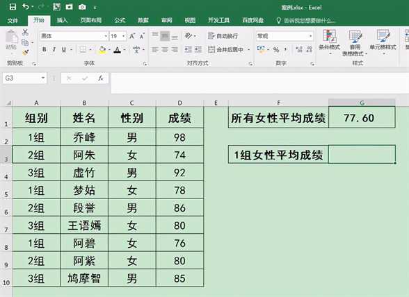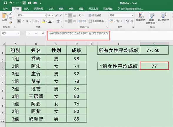 选中G3单元格,在英文输入法状态下输入公式:=AVERAGEIFS(D2:D10,A2:A10,”1组”,C2:C10,”女”),即可返回平均值“77”。