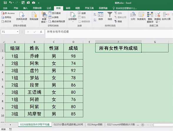 在G3单元格中求取所有1组女性人员的平均成绩。