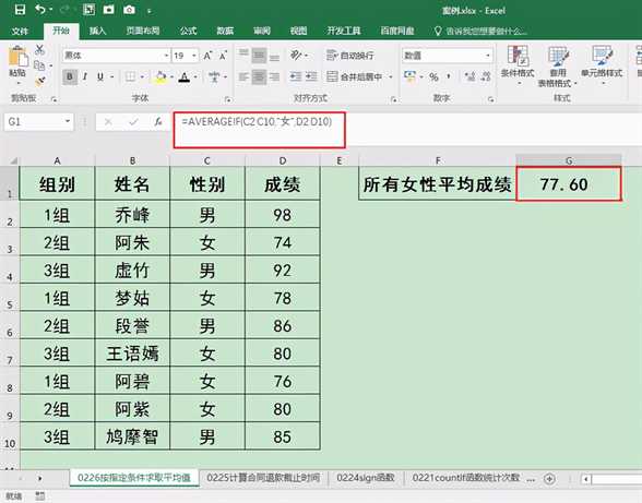 选中G1单元格,在英文输入法状态下输入公式:=AVERAGEIF(C2:C10,”女”,D2:D10),按键盘上的回车键确认即可返回平均值“77.60”。