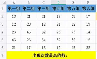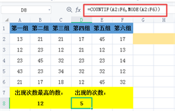 操作方法:选中区域,然后输入公式【=COUNTIF(A2:F6,MODE(A2:F6))】