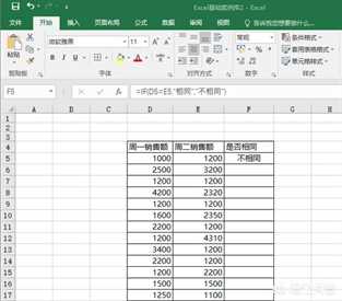 第一步,然后我们在“F5”单元格内输入=IF(D5=E5,”相同”,”不同”)按回车键。备注:输入公式的时候逗号、双引号要用英文格式,