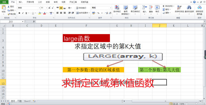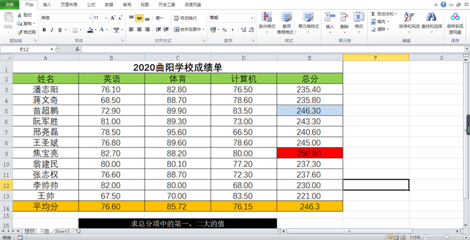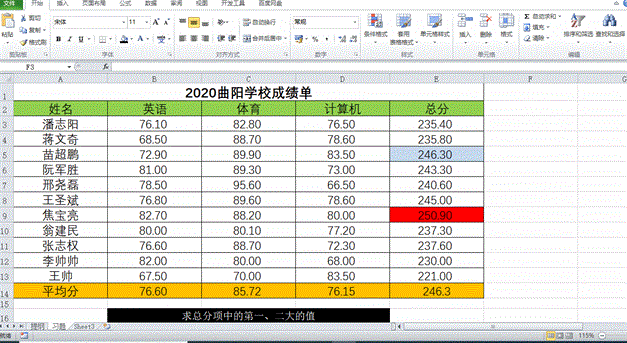 图二是这样的一个成绩表格,根据它的一个题目要求,我们需要求出总分项中排名第一、二大的值,这样的一个要求呢,我们分析下肯定是需要large函数来进行求取一下,那我就通过具体的一个演示,给大家演示一下它的用法!