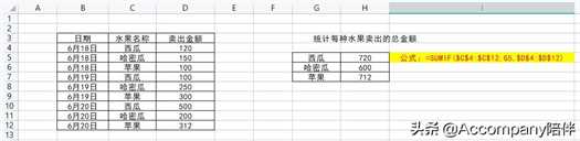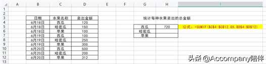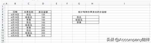 我们在西瓜一栏后面的“H5”单元格,写上公式“=SUMIF($C$4:$C$12,G5,$D$4:$D$12)”然后回车,如下图: