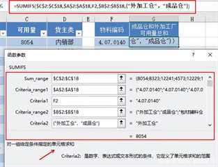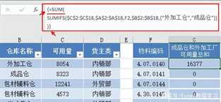 第一个参数求和区域为C列可用量的指定区域,第二个参数条件区域1,是物料编码的指定区域,条件1则是F列下要指定求和的物料;第三个参数是条件区域2,B列仓库名称下的指定区域,第四个参数是条件2,这里要注意的是,它可以是外加工仓,也可以是成品仓,因此出现了一个“或”的关系。