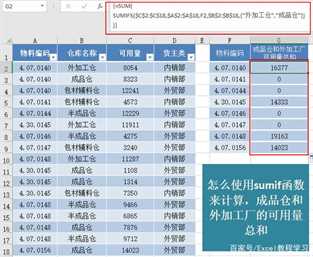 但问题是要计算某个物料在外加工仓和成品仓的总数量,也就意味着又增加了一个条件,即指定求和的物料编码也成为求和函数中的一个条件。
