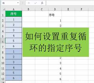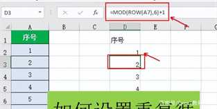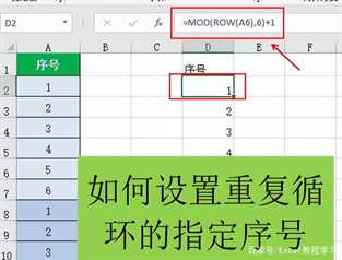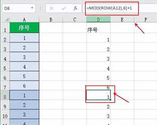 ROW(A12)的结果为12,MOD(12,6)的结果等于0,再加上1,则结果又等于1,如此循环反复下去,便得到了指定重复循环的序号。