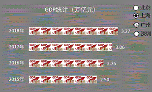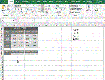 原始数据2015年-2018年北上广深四大城市的GDP数据,其中数据位于B3:E6单元格中。