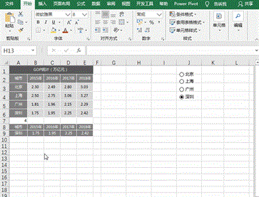 点击“开发工具”选项卡-“插入”-“选项按钮(窗体控件)”,拖动鼠标插入一个选项按钮控件,重命名为城市名“北京;