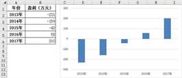 步骤3:美化图表。将非盈利的数据系列(2013年、2014年和2015年)调整为绿色,盈利的数据系列(2016年和2017年)调整为红色。选中“绘图区”,将鼠标指针移动到绘图区的上边框,当鼠标指针变成双箭头时向下拖,为图表标题留出位置,再将鼠标指针移动到绘图区的下边框,向上拖,为图表脚注留出位置,然后采用插入“横排文本框”的方法创建标题和脚注,通过调整字号大小、行间距、填充色等对图表进行进一步的美化调整,完成图表制作。