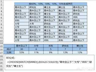 “ =CHOOSE(MATCH(RAND(),{0,0.6,0.7,0.8,0.9}),”高中及以下”,”大专”,”本科”,”研究生”,”博士生”)”。