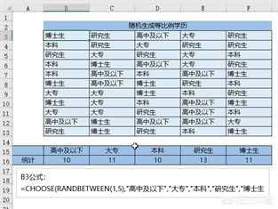 公式为:“=CHOOSE(RANDBETWEEN(1,5),”高中及以下”,”大专”,”本科”,”研究生”,”博士生”)”。