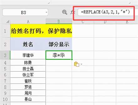 1、在B3单元格输入【=REPLACE(A3,2,1,”*”)】
